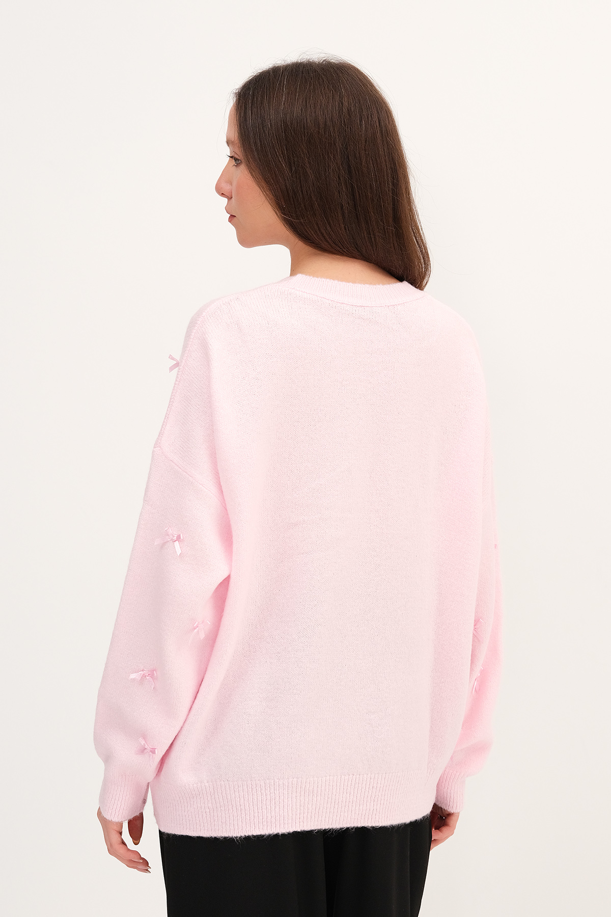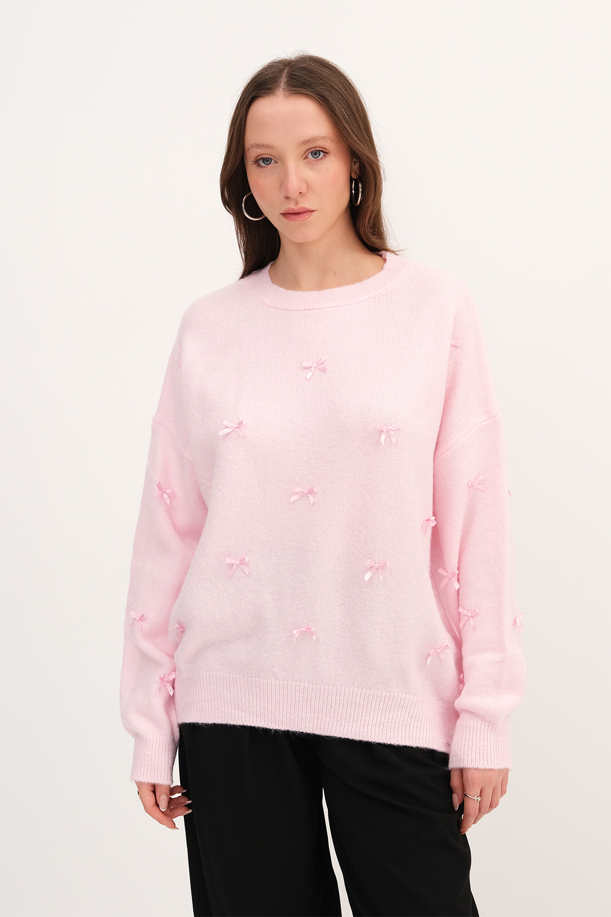 * Bisiklet yaka, uzun kollu,* Düşük omuz, düz renk,* Fiyonklu triko kazak,* Ürün içeriği: %74 Akrilik %19 Polyester %7 Elastan* Manken üzerindeki ürün standart bedendir.* Numune beden ölçüleri: Boy: 59 cm Göğüs: 120 cm Kol boyu: 45 cm (1-3 cm değişiklik gösterebilir)* Ürün çekimlerinde renkler, ışık farklılığından dolayı değişkenlik gösterebilir.