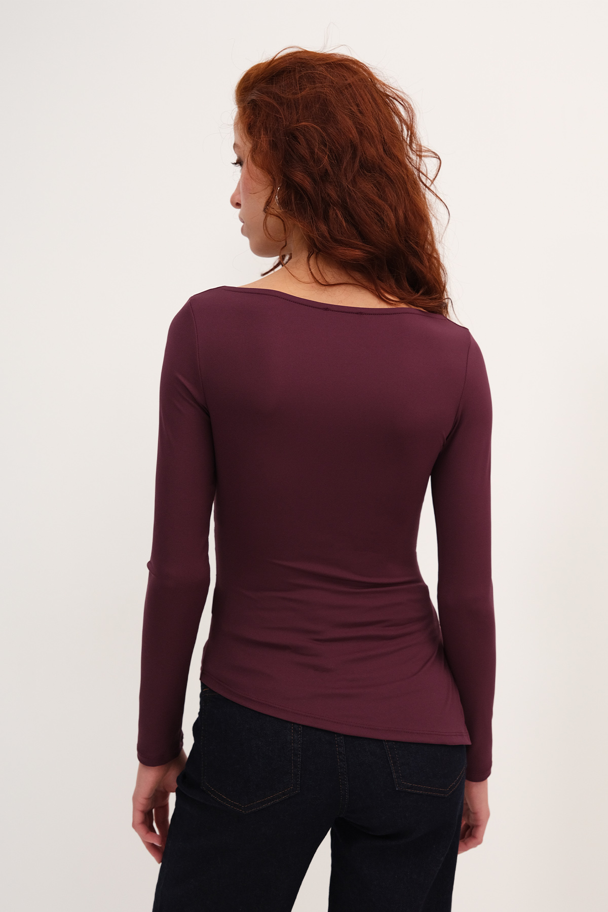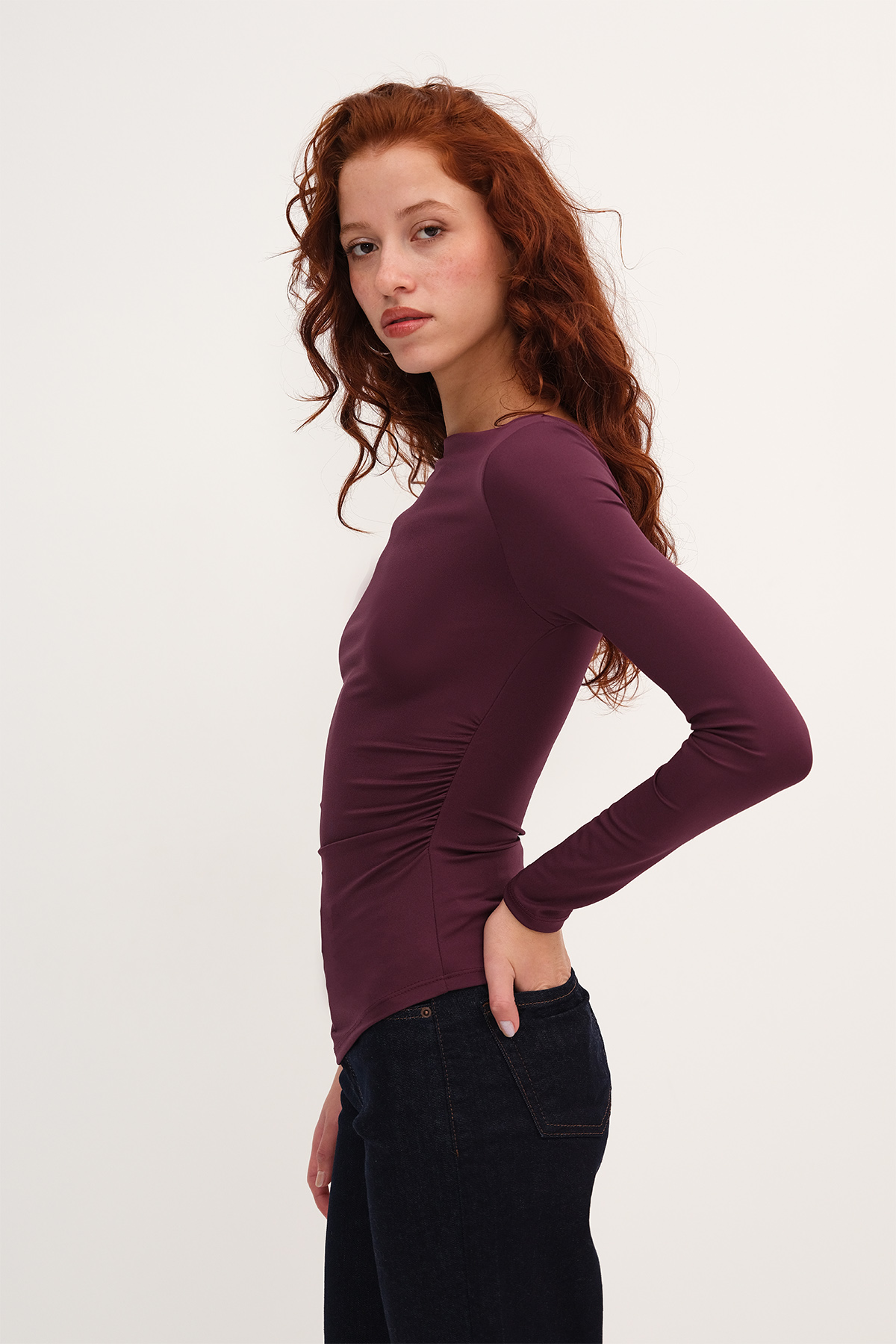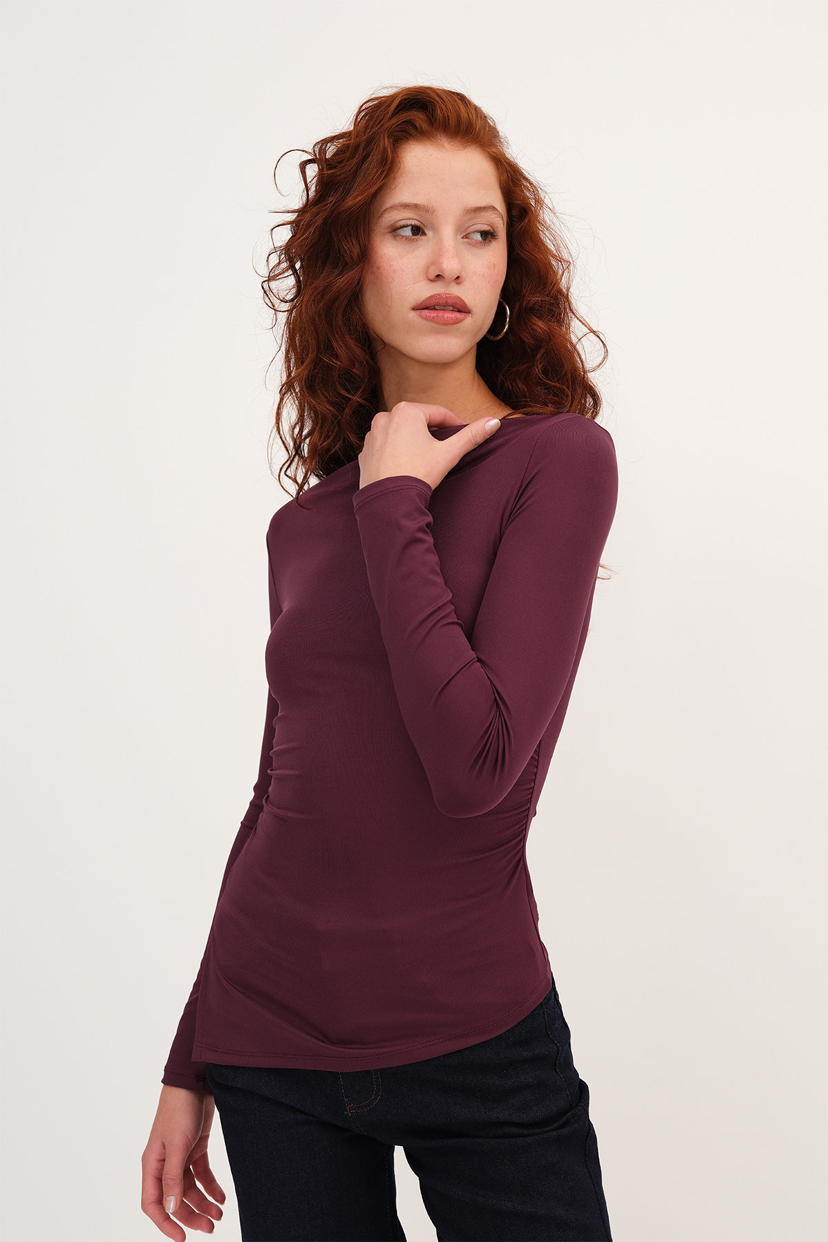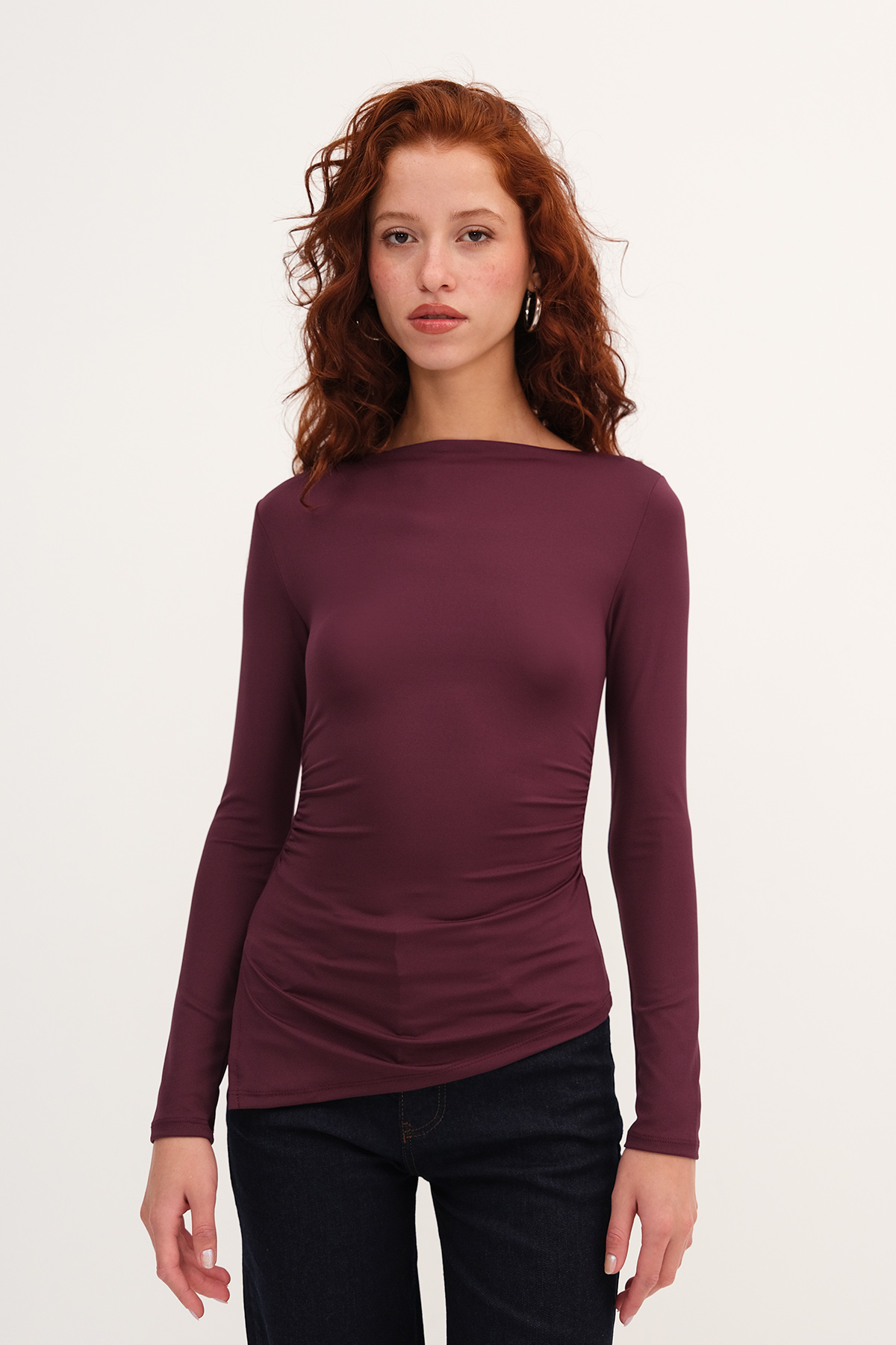 * Kayık yaka, uzun kollu,* Yanı büzgülü, asimetrik kesim,* Düz renk, vücudu saran bluz,* Ürün içeriği: %94 Polyester %6 Elastan,* Manken üzerindeki ürün 36/S bedendir.* Numune Beden Ölçüleri: Boy: 55 cm Göğüs: 56 cm Kol Boyu: 55 cm (1-3 cm arasında değişiklik gösterebilir)* Ürün çekimlerinde renkler, ışık farklılığından dolayı değişkenlik gösterebilir.