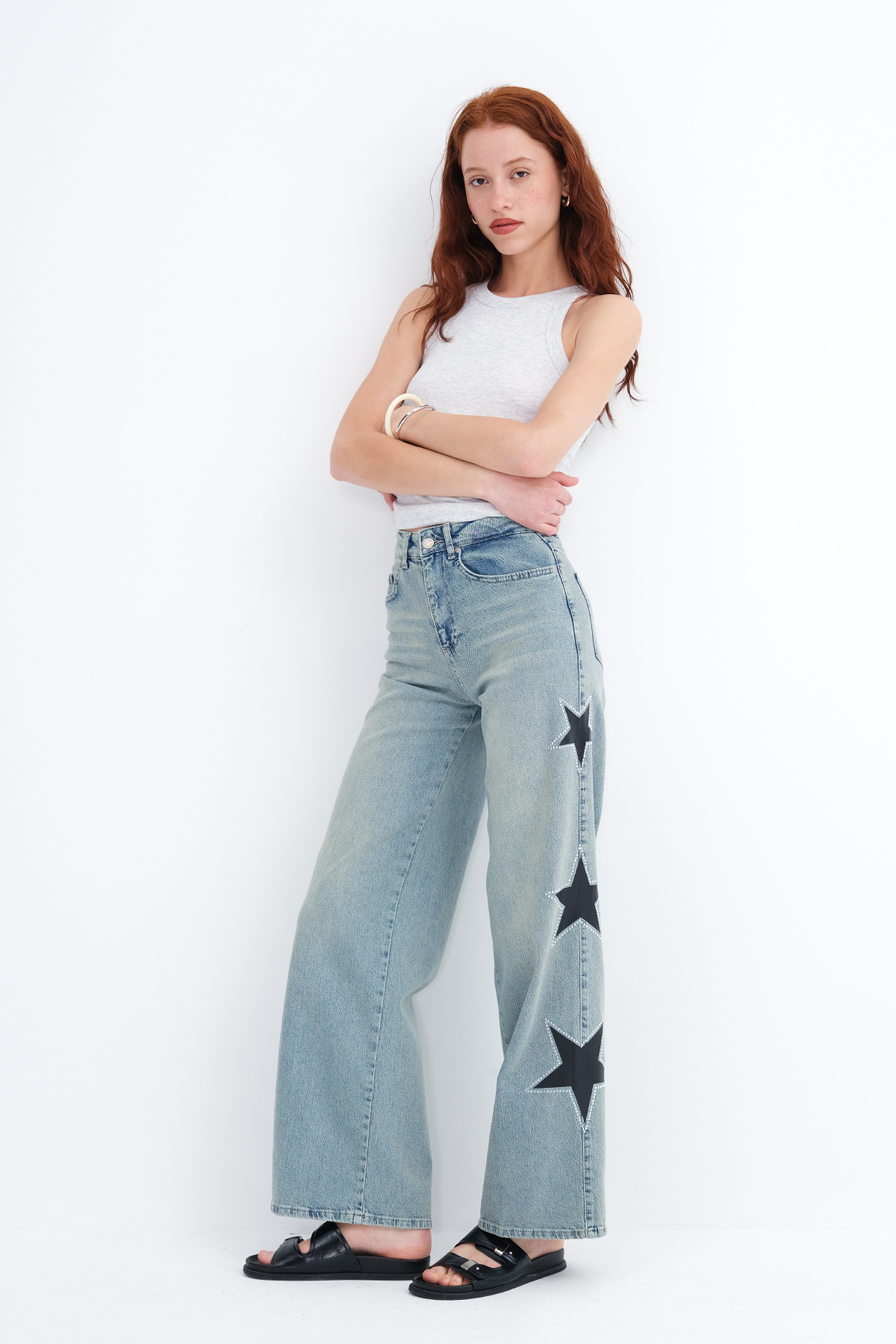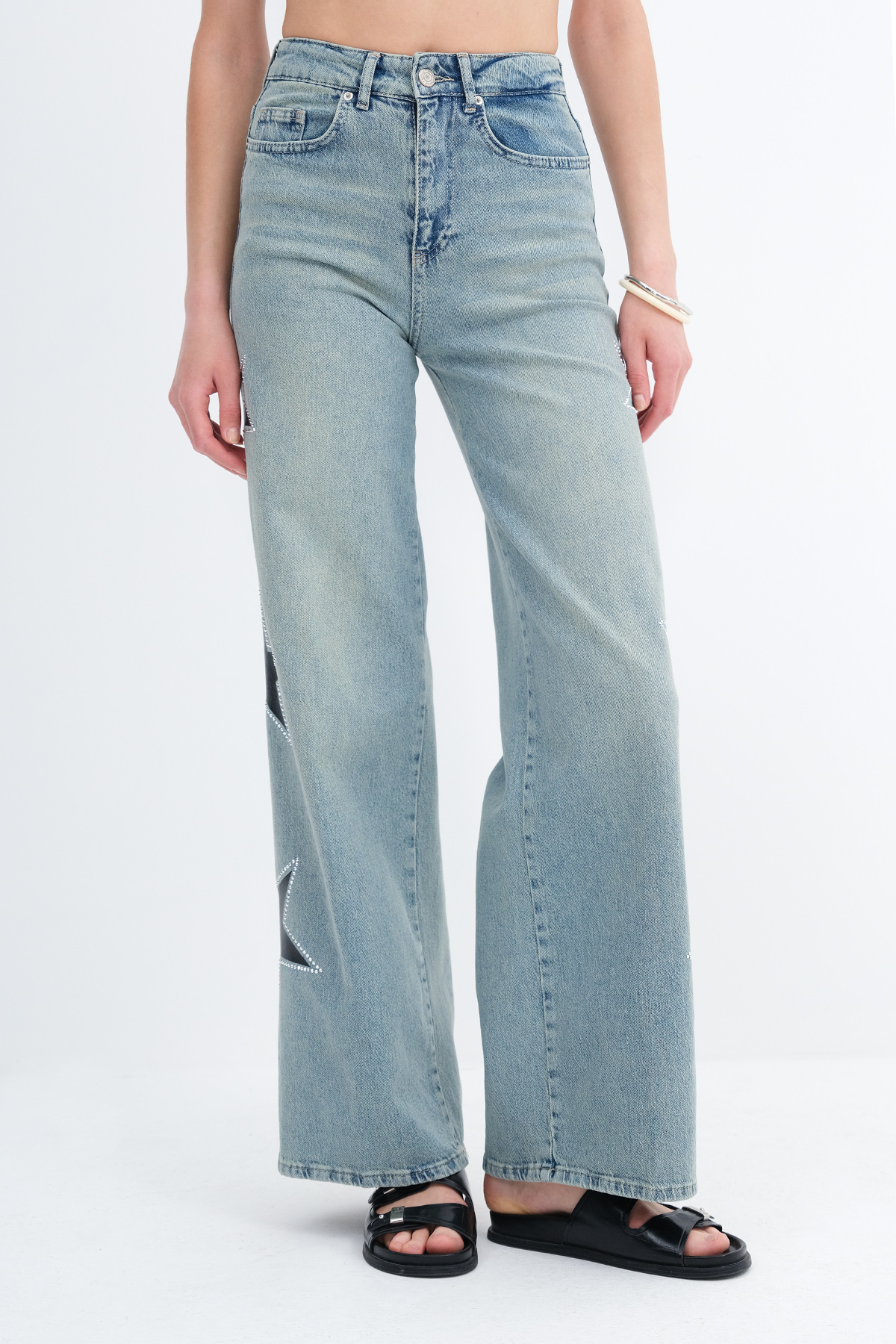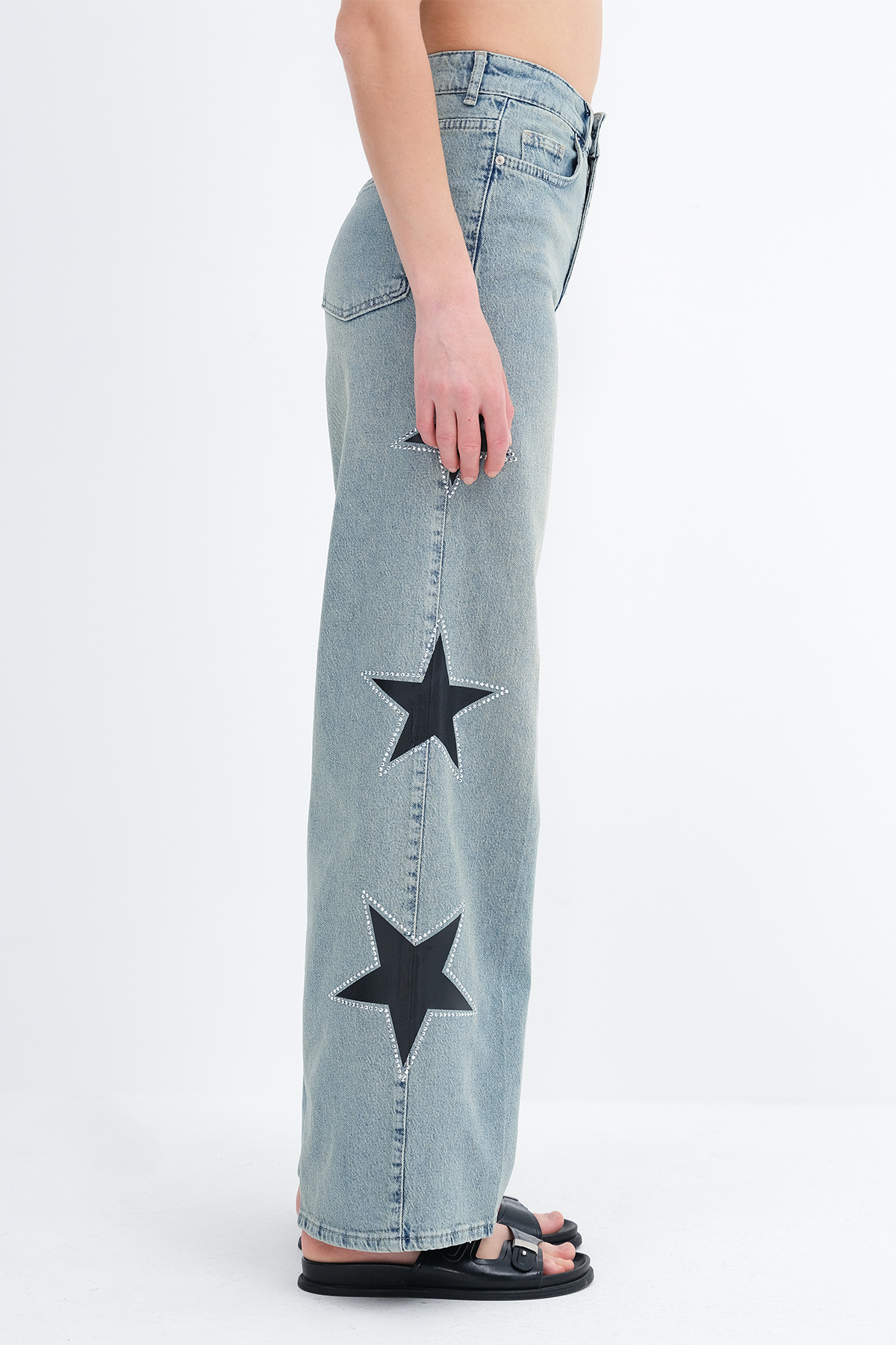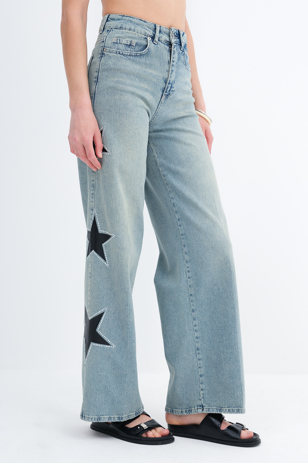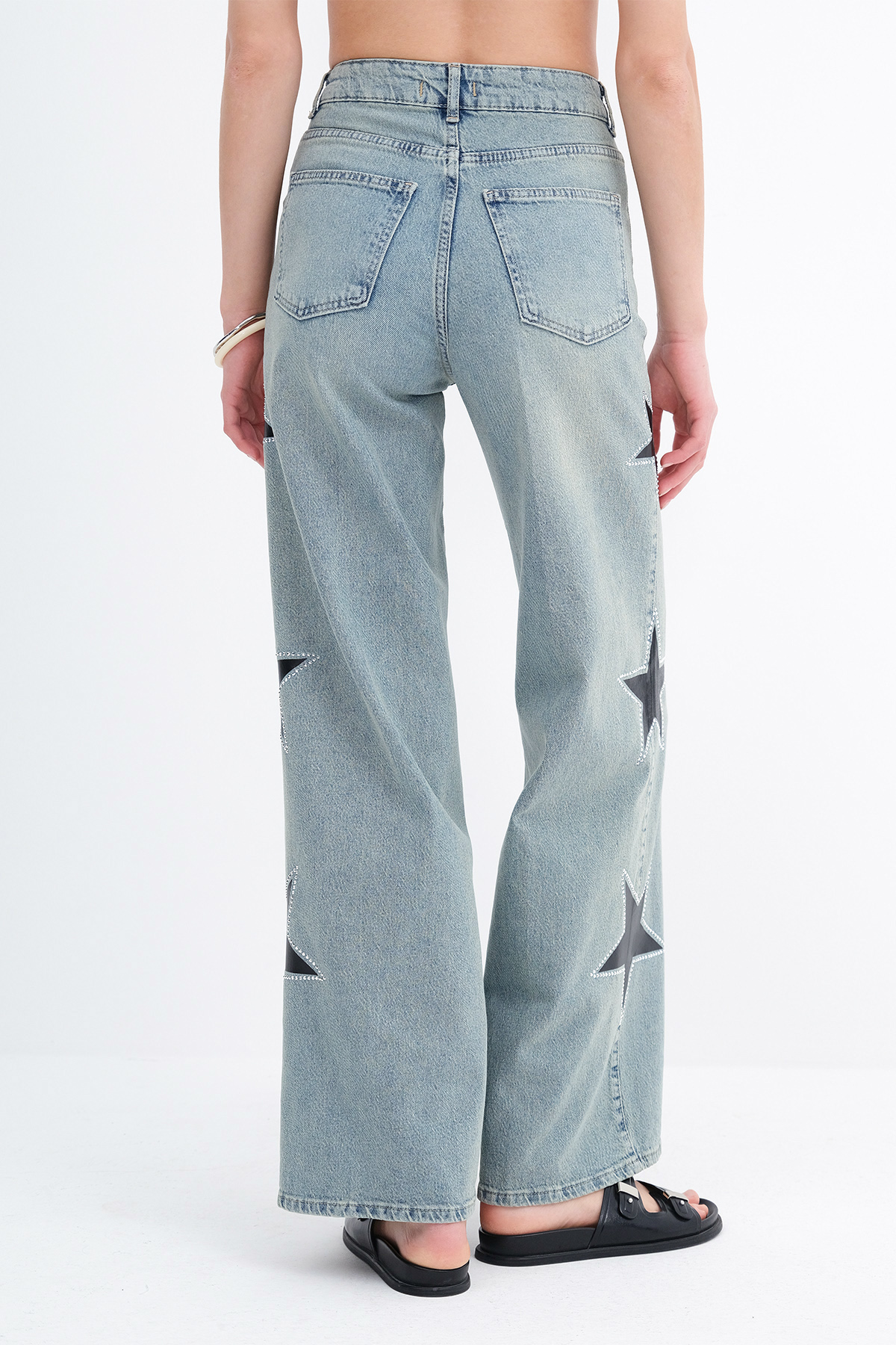 * Yıldız detaylı, wide leg jean pantolon,