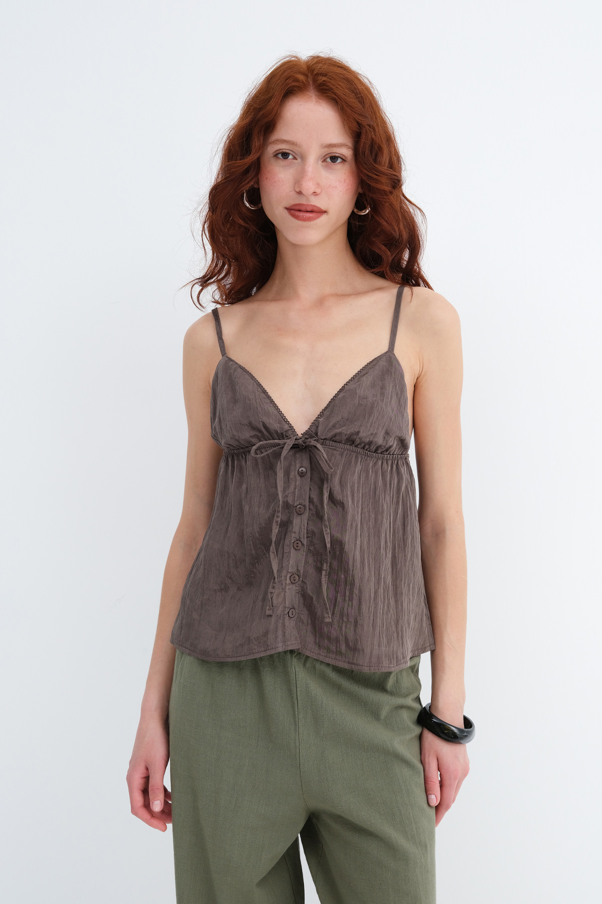 * Göğüs kısmı lastikli, bağlamalı, düğmeli bluz,