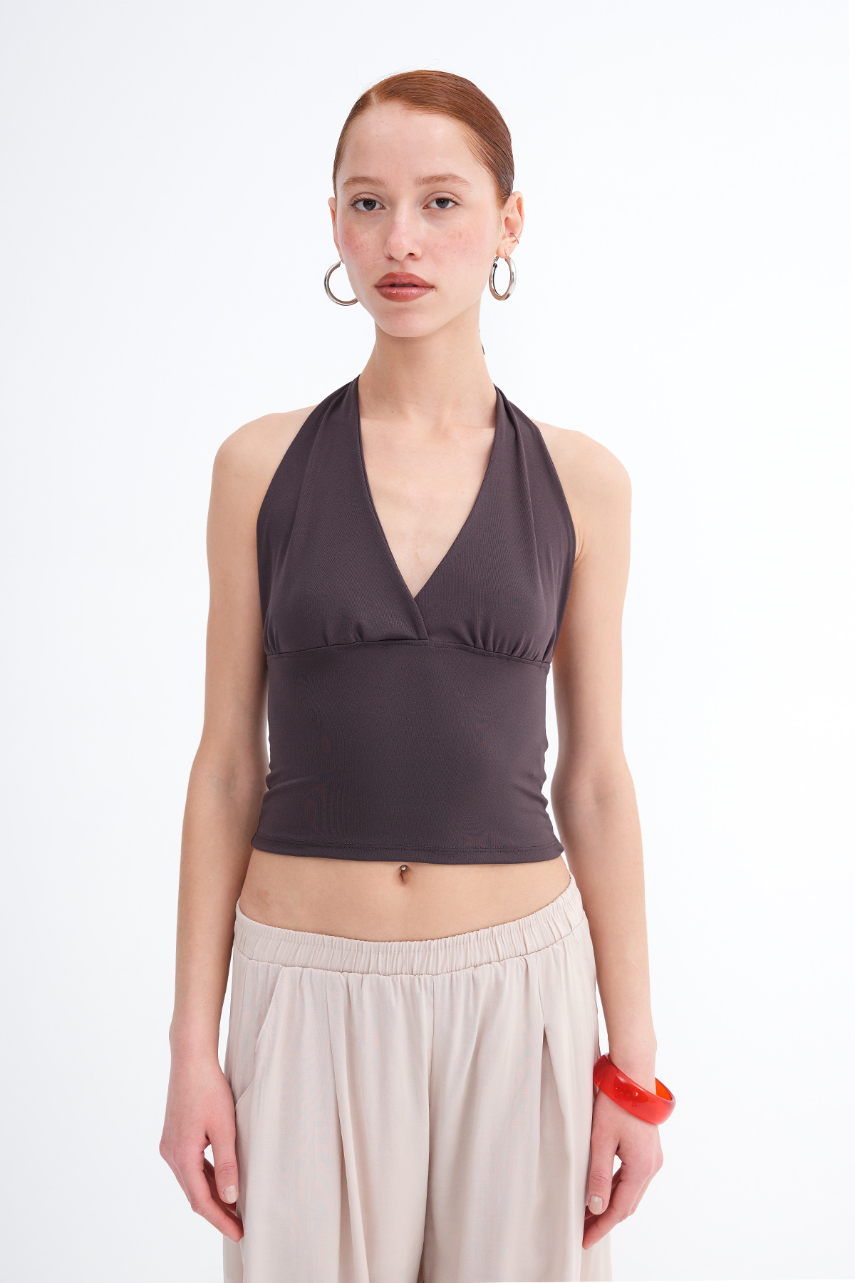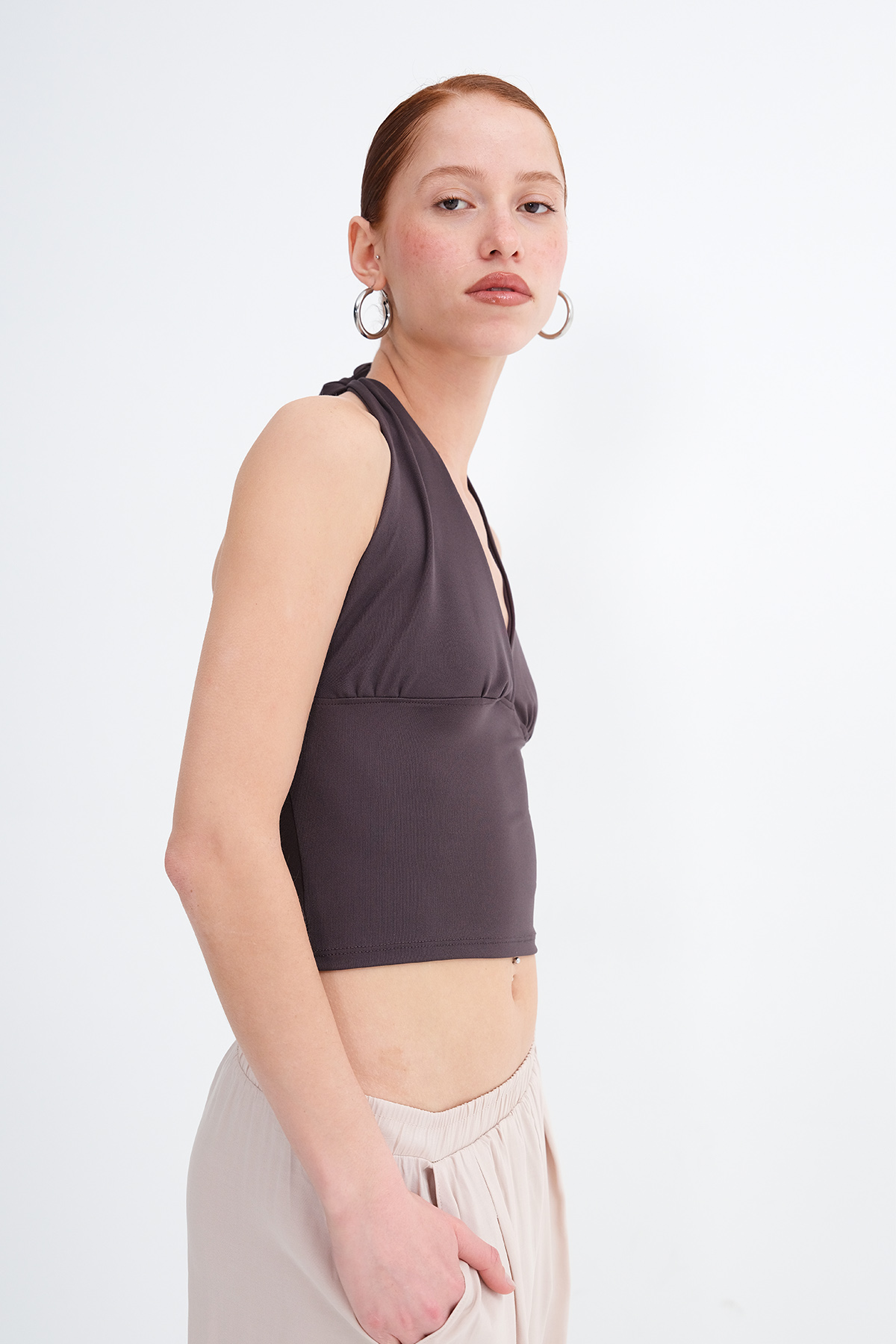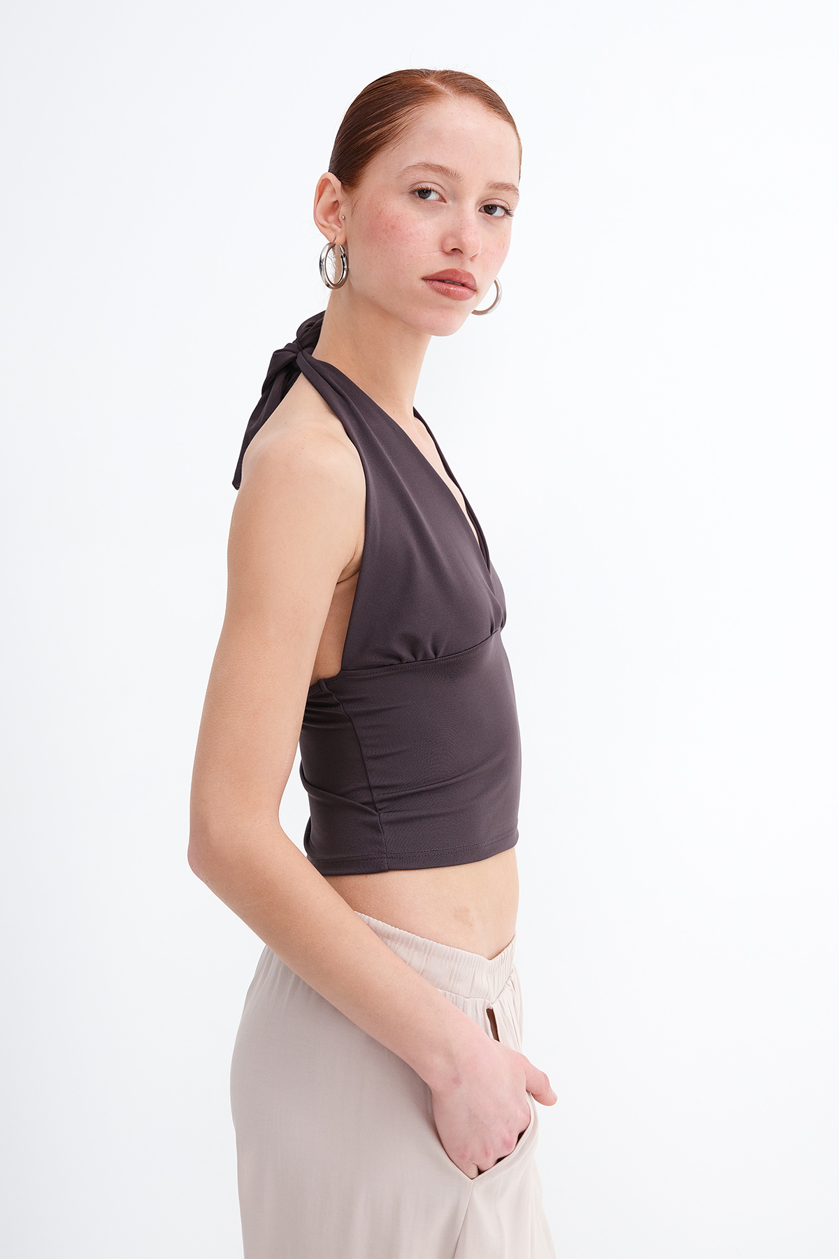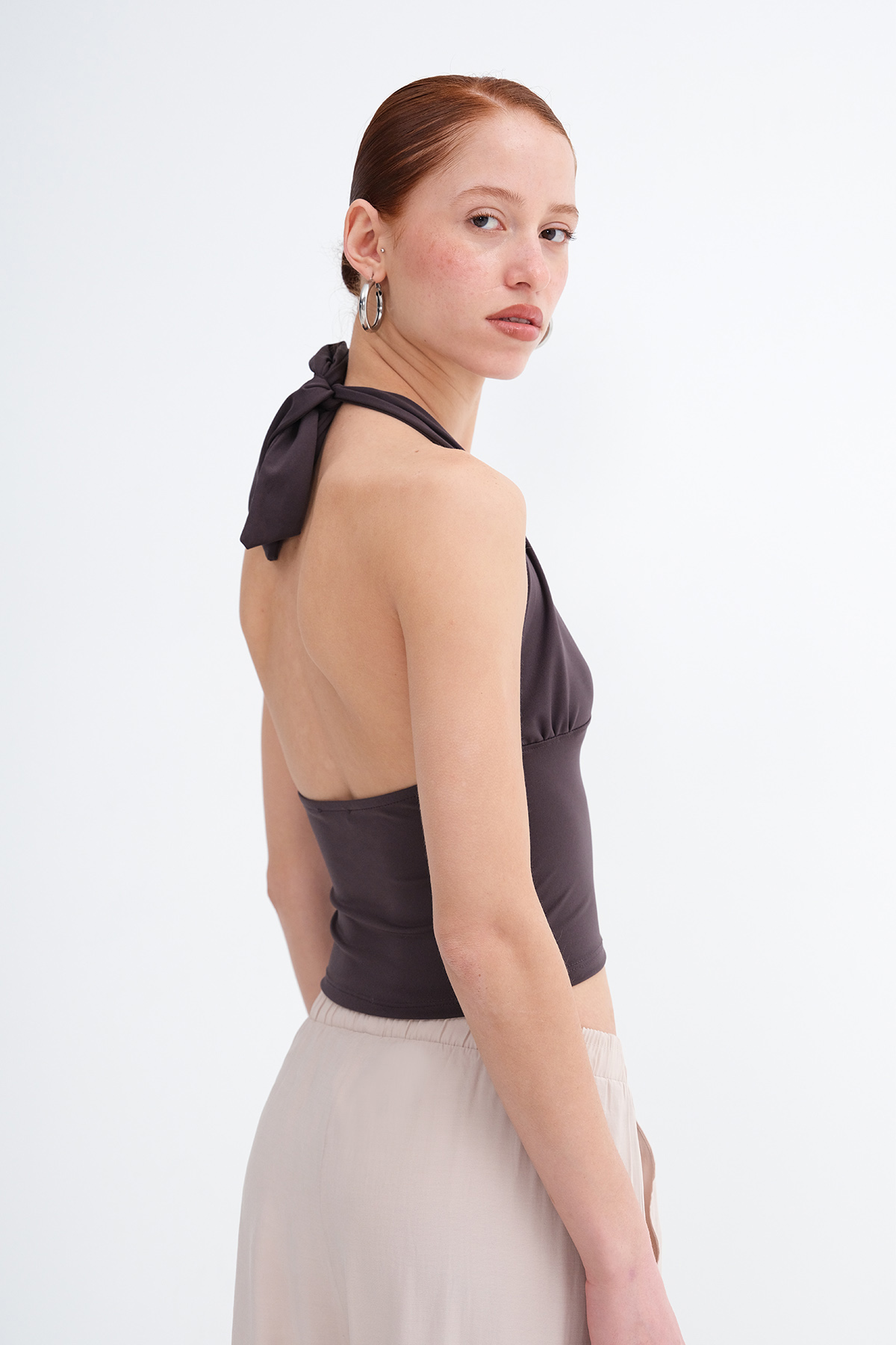 * Düz renk, sırt dekolteli, crop bluz,